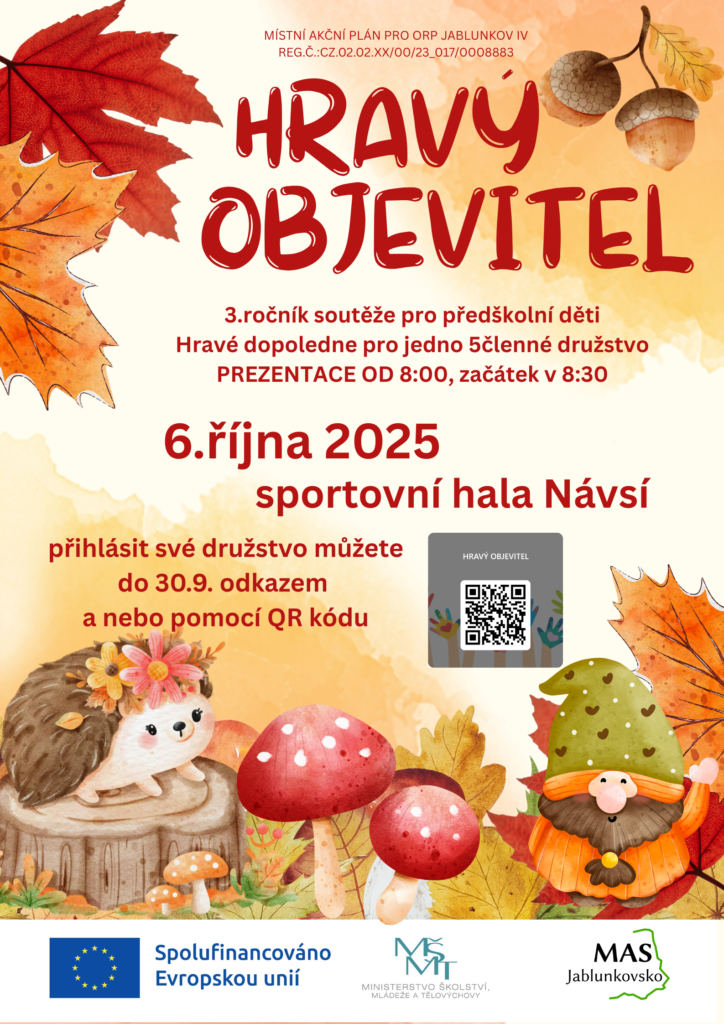 Soutěž Hravý objevitel 24.09.2025 Termín realizace: 06.10.2025 Místo realizace: sportovní hala Návsí Časová dotace: od 8:00 do 11:00 hodin Určeno pro: děti MŠ Přihlášení: registrovat se můžete ZDE Další informace k průběhu soutěže naleznete ZDE.